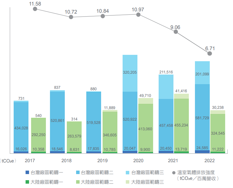 | 範疇一+範疇二 | 台灣廠區+大陸廠區 | 公噸二氧化碳當量(tCO2e/百萬營收)/百萬營收 | 11.58 | 10.72 | 10.84 | 10.97 | 9.06 | 6.71 |